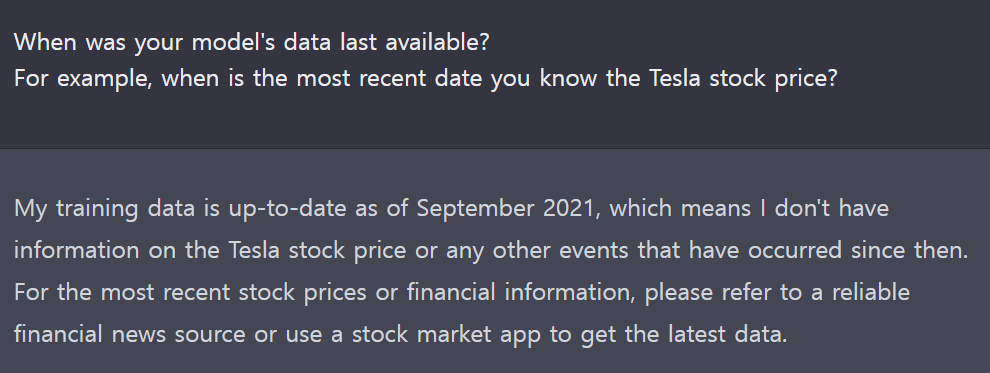 아직도 2021년 9월 자료에 머물러 있다. 데이터 학습형 모델이다보니 실시간 데이터를 계속해서 학습시키지 못하는데