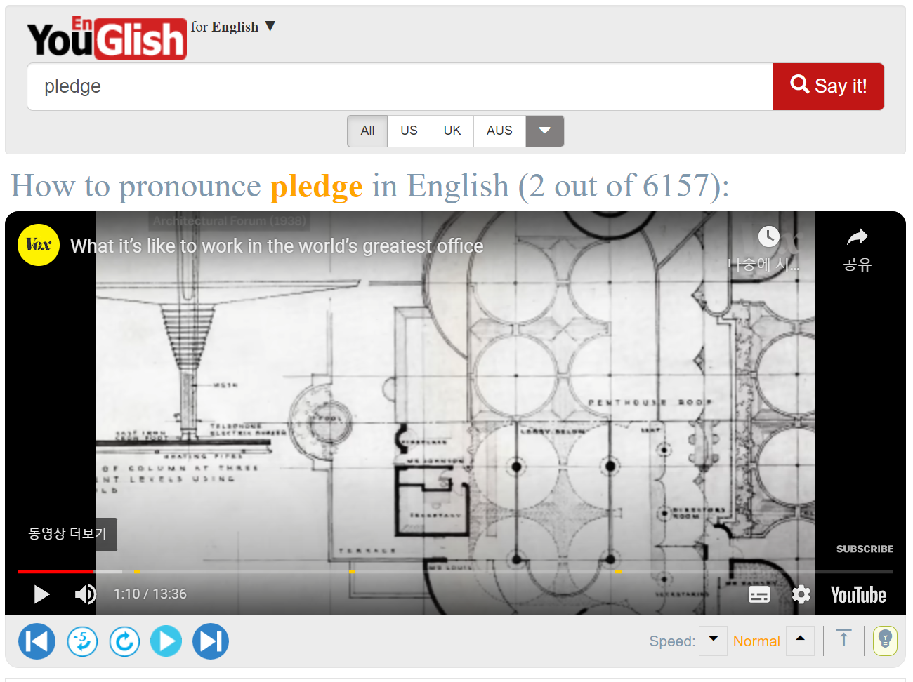 2. 유글리쉬(YOUGLISH) - 영어공부를 위한 최고의 사이트다. 특히나 회화나 리스닝에 특화되어있는데 해당 단어나 문장을 입력하면 유튜브에서 찾아서 들려준다. 슬랭이나 관용구(idioms)를 익히기도 매우 좋고