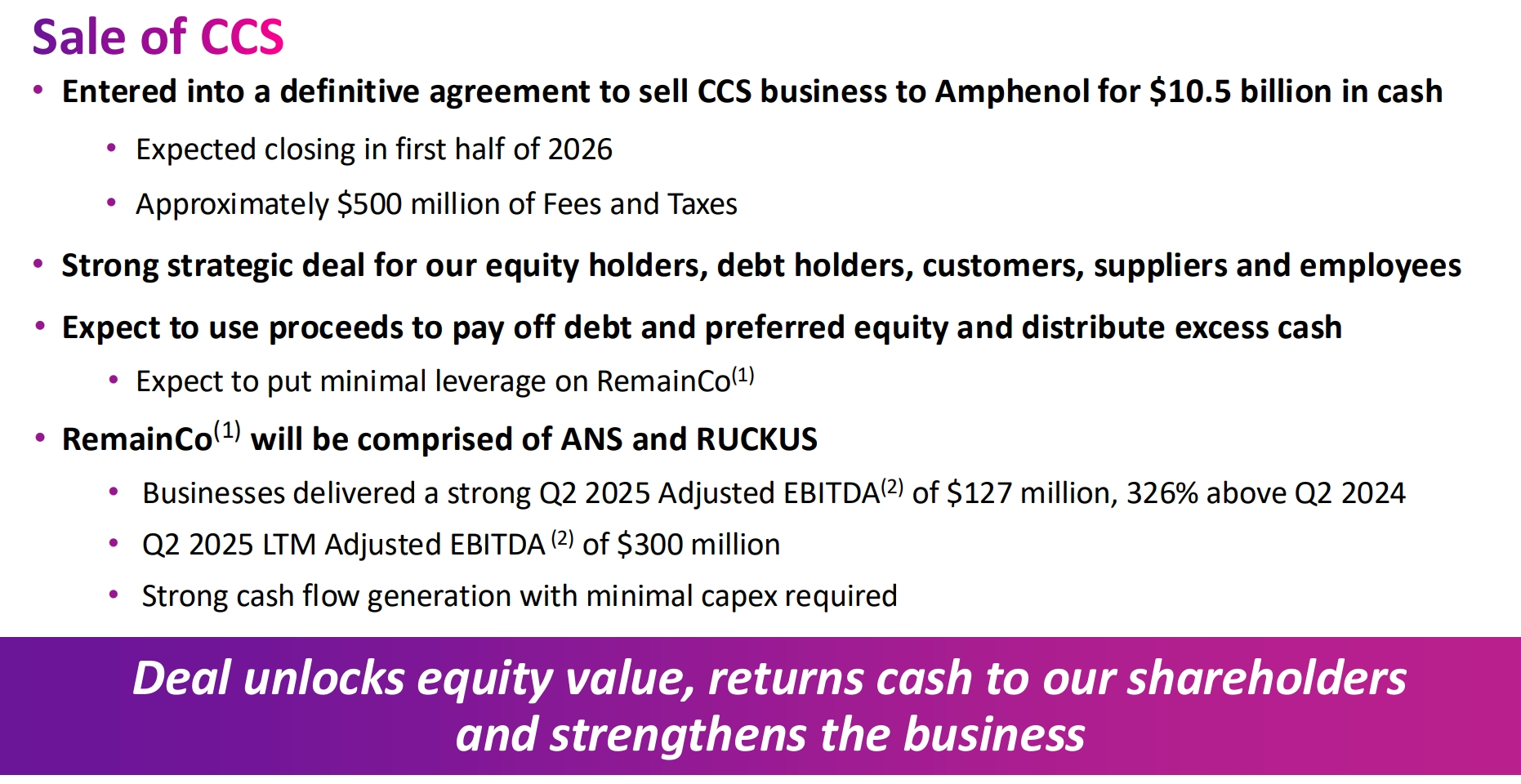 CommScope(티커: COMM)은 2026년 CCS(Connectivity & Cable Solutions) 부문 매각을 통해 대규모 현금 유입과 재무구조 개선을 달성할 예정임