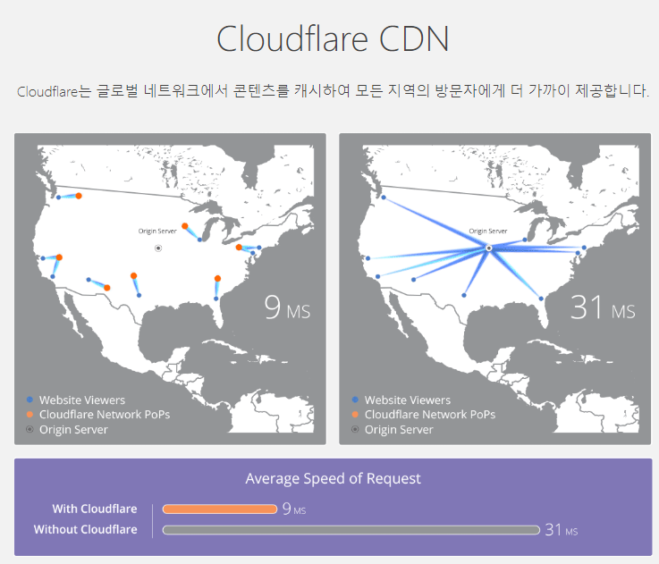 CDN (Content delivery network 또는 content distribution network) : 사용자가 원격지에 있는 서버로부터 데이터를 받지 않고 가까운곳에 위치한 캐시서버에서 데이터를 전달해주는 기술 클라우드 플레어가 세계곳곳에 CDN서비스를 하기위한 서버를 둠으로써 원래 서버의 트래픽을 줄여주고 속도향상하는 서비스 |