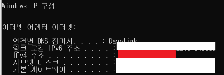 2. 각 컴퓨터의 도스창에서 IPCONFIG를 입력하면 아래와 같은 화면이 나온다
