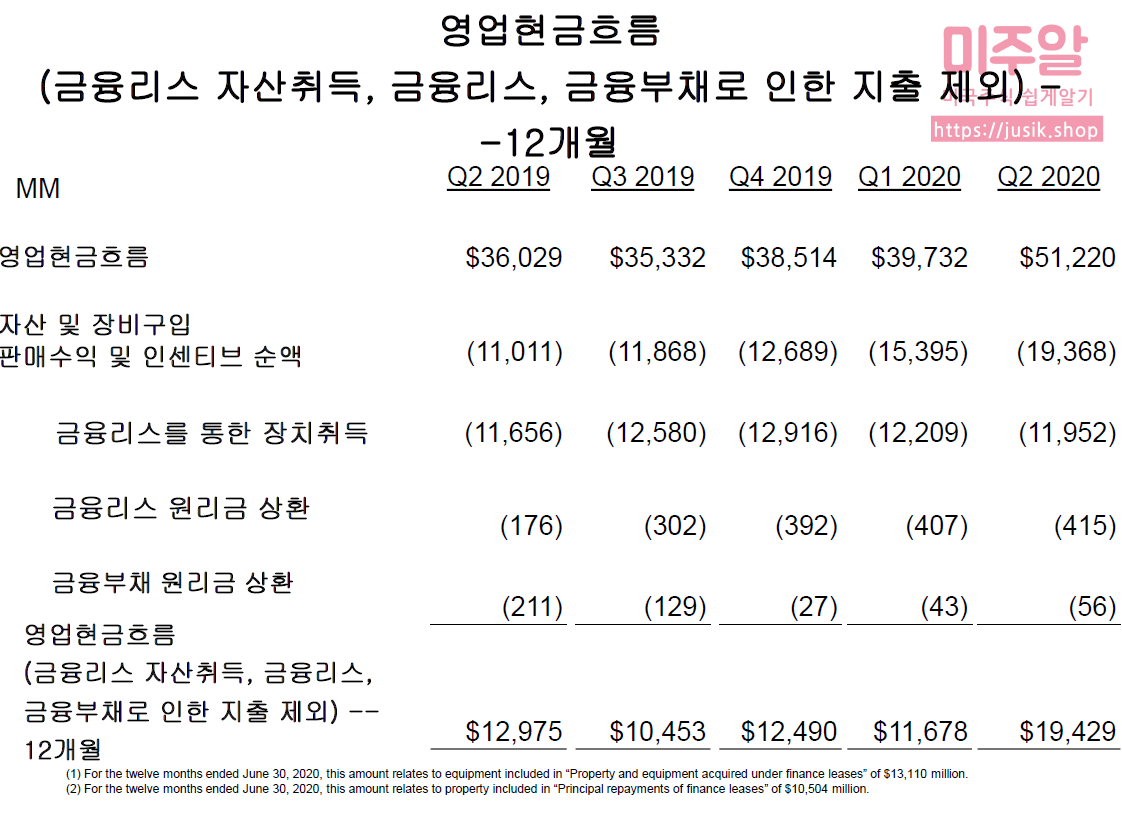 아마존은 영업이익보다 잉여현금흐름을 가장 중요하게 내세우고 있다. 현금흐름은 회계정책으로 인한 왜곡이 없어 재무상태표와 손익계산서의 보완자료로서 매우 중요하게 생각하는데, 아마존은 시설투자 감가상각비 비중이 높아 그 만큼 비용인식의 기간차이가 나타나는 것을 이해하고 자료를 해석하면 되겠다. (영업현금흐름은 증가한데 비해 자본적지출은 상대적으로 비율이 하락하고 있음, 이 또한 기간왜곡이 발생할 수 있어서 꼭 손익계산서, 현금흐름표 최근 5개년 흐름을 같이보자)
