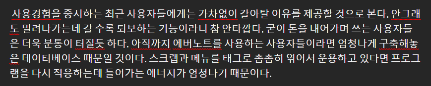 사용경험을 중시하는 최근 사용자들에게는 가차없이 갈아탈 이유를 제공할 것으로 본다. 안그래도 밀려나가는데 갈 수록 퇴보하는 기능이라니 참 안타깝다. 굳이 돈을 내어가며 쓰는 사용자들은 더욱 분통이 터질듯 하다. 아직까지 에버노트를 사용하는 사용자들이라면 엄청나게 구축해놓은 데이터베이스 때문일 것이다. 스크랩과 메뉴를 태그로 촘촘히 엮어서 운용하고 있다면 프로그램을 다시 적응하는데 들어가는 에너지가 엄청나기 때문이다.